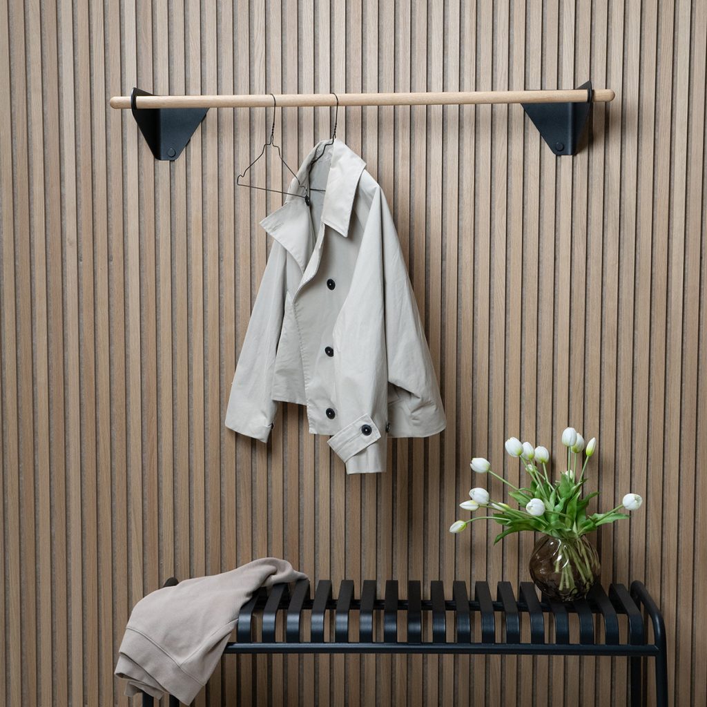 The Linn Coat Rail is a sleek, minimalist coat rail made from solid oak and powder-coated steel. Designed to integrate beautifully with your WoodUpp Akupanels, it’s the perfect addition to hallways, bedrooms, or any space that needs a stylish storage upgrade. The rail installs easily, stays firmly in place, and can hold everything from winter coats to handbags—with room to spare at the ends for quick-grab items.